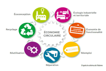L’économie circulaire est un concept global qui prône une gestion durable des ressources : sortir du modèle linéaire « extraire, fabriquer, consommer et jeter » pour tendre vers une consommation sobre et responsable des ressources naturelles et des matières premières primaires en limitant la production de déchets à la source, en favorisant le RÉEMPLOI, le RECYCLAGE et la VALORISATION. »