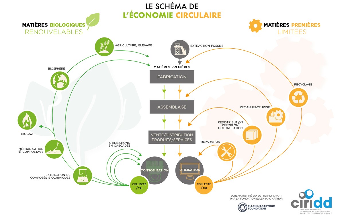 L’économie circulaire vise un changement de modèle économique dans lequel les acteurs réinventent leurs pratiques qui se veulent plus durables. De l’approvisionnement des matières premières à la gestion raisonnée des déchets en passant par l’éco-conception des produits, dans le but de faciliter le réemploi direct, la réutilisation des produits, le recyclage, une bonne gouvernance et une bonne coordination des acteurs concernés sont indispensables.