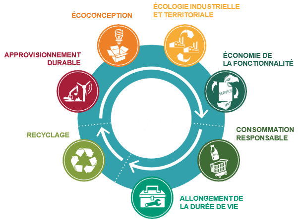 Ce modèle repose sur une utilisation optimum des ressources et sur la création de boucles de valeur positives. Il met notamment l'accent sur de nouveaux modes de conception, production et consommation, le prolongement de la durée d’usage des produits, la réutilisation et le recyclage des composants. »